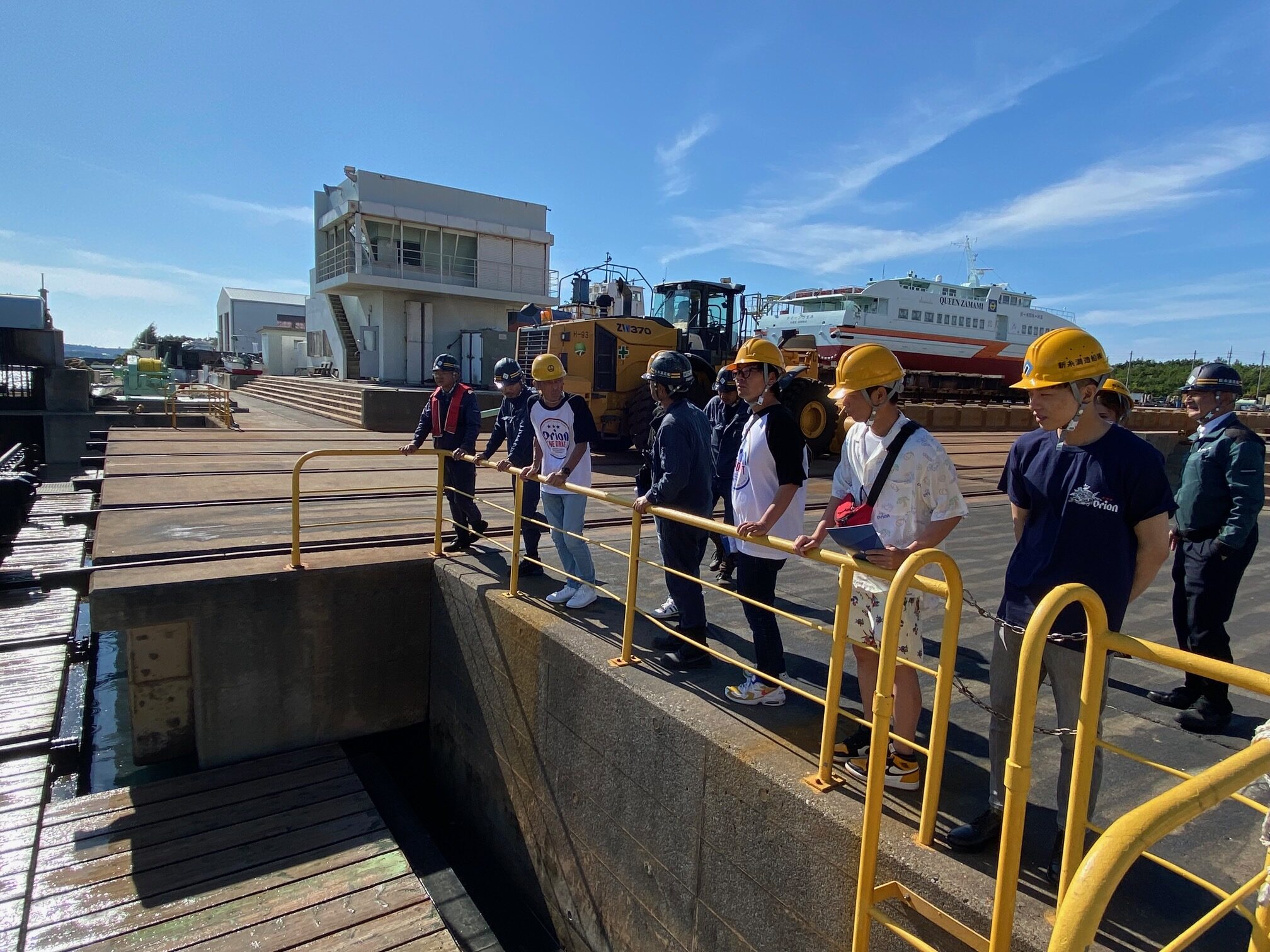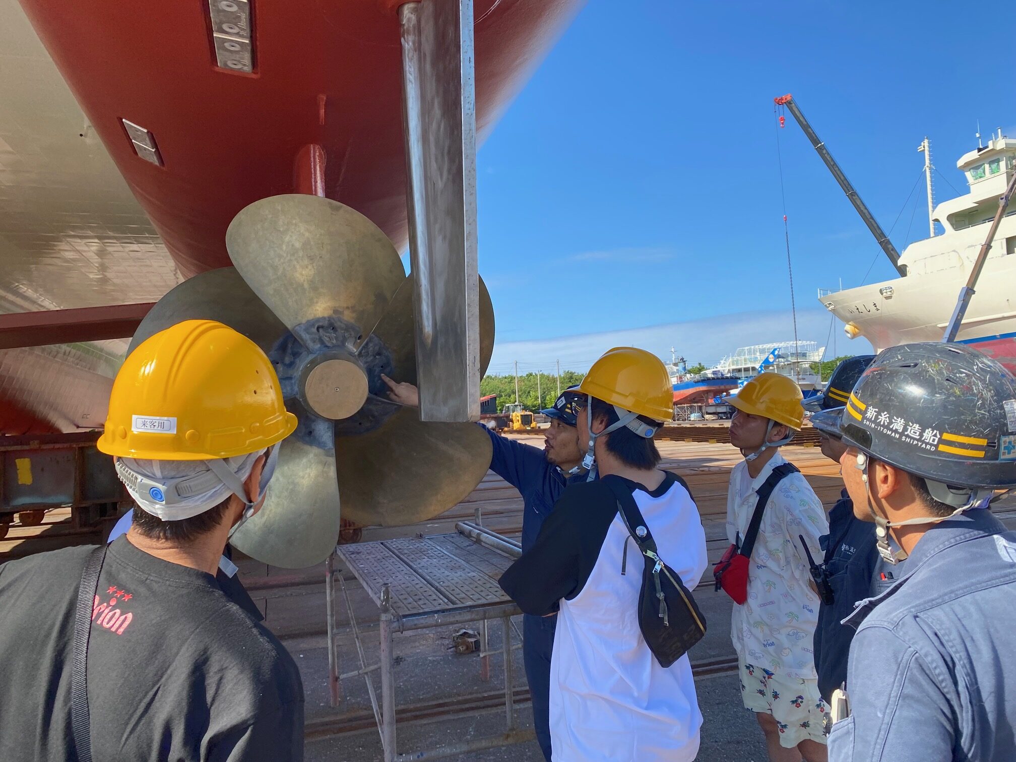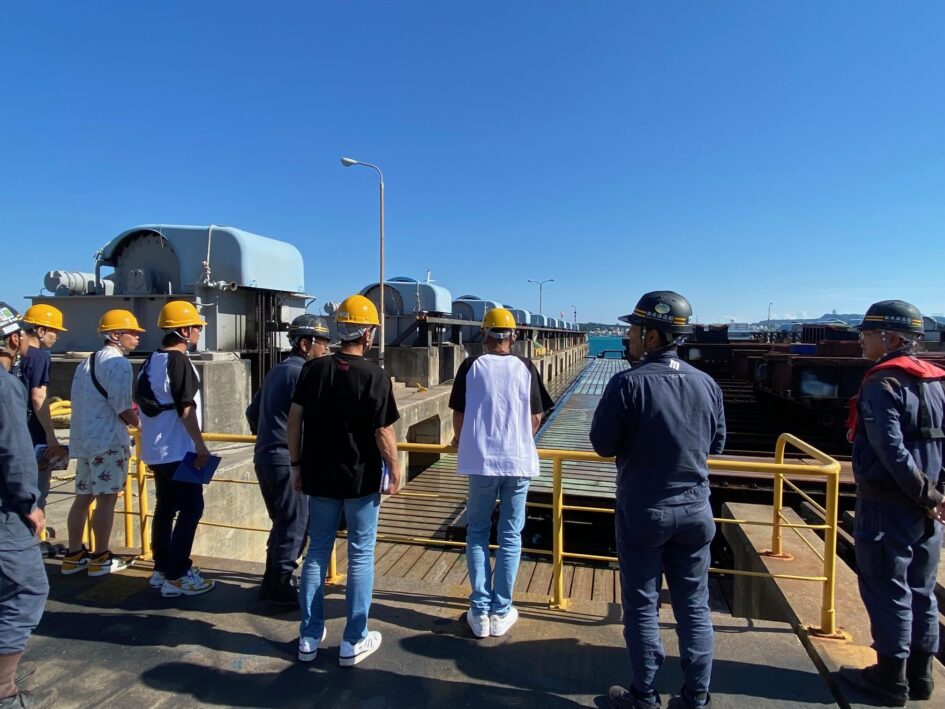 構内は小門造船とはまた違った構造や作り、そして普段小門造船ではなかなか見ることのないドッグに入っている船にみんな釘付け!!